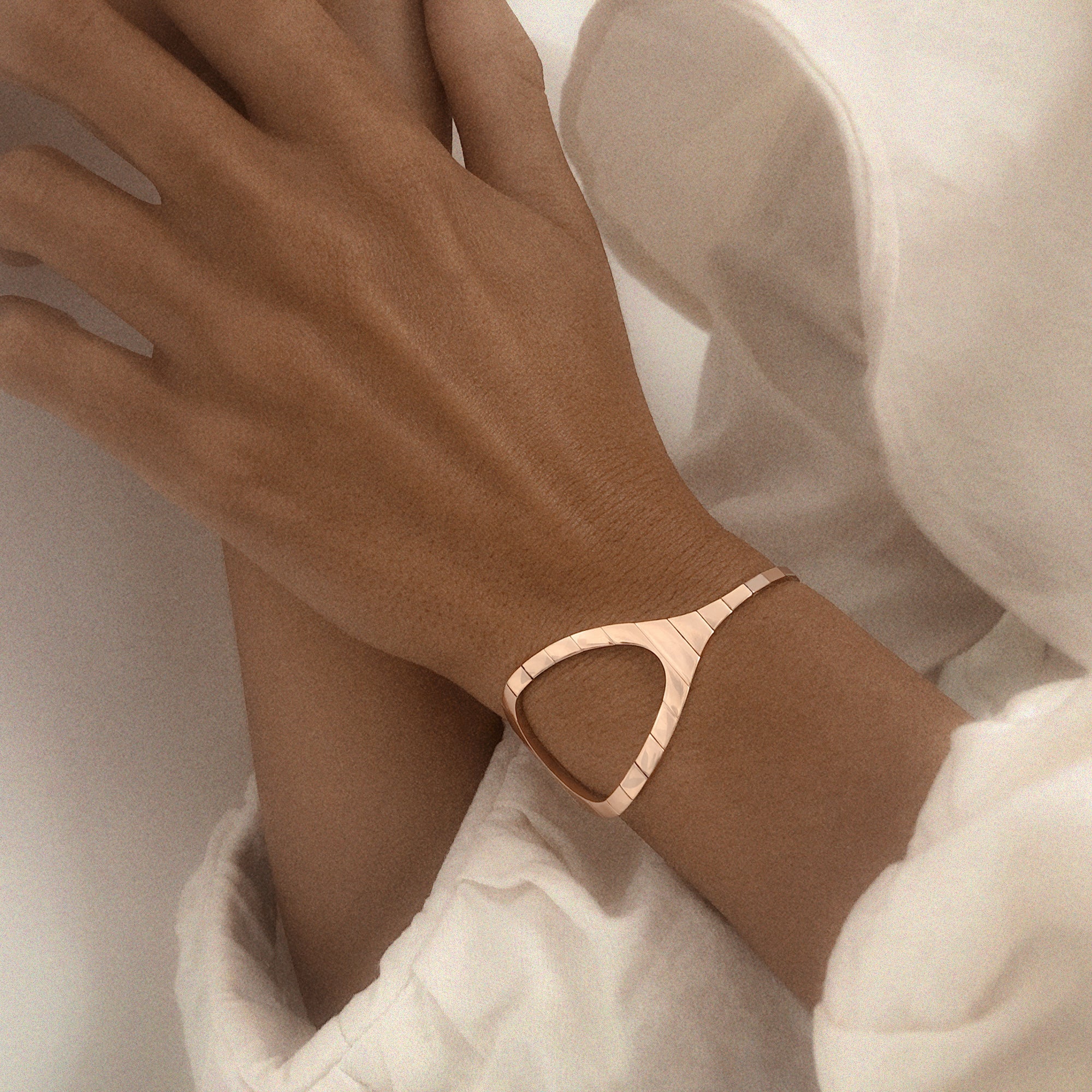 标志性 Styloïde 手镯的全新演绎。这款 18K 玫瑰金手镯优雅地凸显了腕骨——茎突,而茎突正是其得名之作。